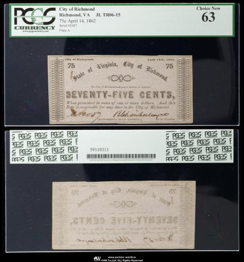 USA アメリカ合衆国 City of Richmond, Virginia 75Cents 1862 AU~UNC